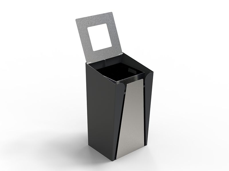 Cette poubelle urbaine carrée design est entièrement réalisée en acier avec couvercle relevable. Sa conception permet l’utilisation de deux couleurs ou de deux matières différentes (par exemple l’acier inoxydable 316 et l’acier galvanisé thermolaqué) en un seul produit. Cela donne des possibilités de composition pratiquement illimitées. Le panier peut en outre comporter un logo, une inscription ou un pictogramme découpé au laser sur la face avant.